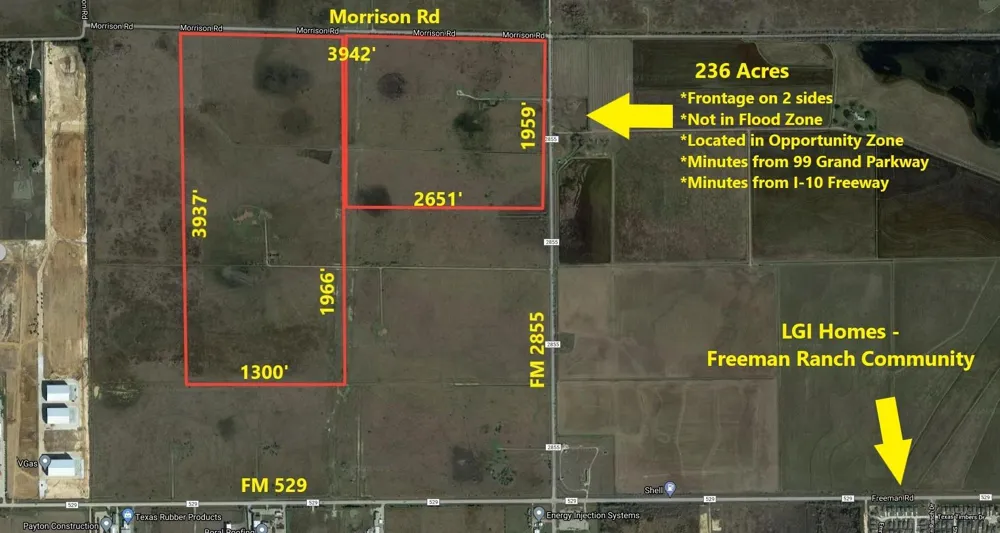 236 Acres of prime real estate located in the pathway of growth! 10 minutes from 1-10 and 99 Grand Parkway! 15 minutes from Katy Mall. Rapidly growing area with multiple subdivisions within a 2 mile radius. The property is level and perfect for development. Cattle are on the property. Do not enter the property without an appointment with the listing agent. Drive-by showings are available. The property has significant road frontage on both Morrison Rd and FM 2855. Excellent opportunity for Residential or Commercial development. AG EXEMPT/PERIMETER FENCED/CURRENTLY BEING USED FOR CATTLE GRAZING/HAS WATER WELL.